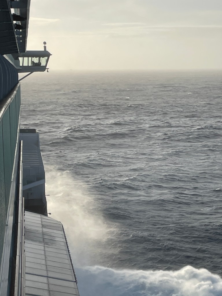 The Observation lounge is one level above the bridge and has a fabulous view forward. We would sit up there and watch the ship riding up and down the swells. This is a huge ship, yet we managed to spray water up and over the bow as we dipped into the troughs and ploughed up and through the wall of water ahead – exhilarating! Each time another big swell came there was a collective “wow” from all watching, followed by nervous giggles! Day 8 the wind dropped to around 20 knots, and as we have been travelling at a constant 17knots, it is felt a lot calmer. This was just one day; the wind has been around 40 knots for most of the trip.