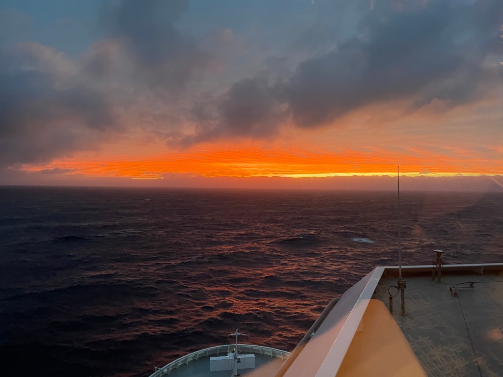 We were at sea for 11 days, I saw 2 other boats on day 11, we had our Medi-vac on day 4, but other than that we have not seen any other signs of life besides what is here on this ship. It has been so peaceful. We have been able to find quiet spots and been able to relax and just ponder this amazing planet and the enormity of the ocean in front of us which is 5km deep right here. Watching the ever-changing clouds and the colours, the swells and currents. The gentle hum of the engines underfoot and the slight sideways rock is reassuring as we make our way towards land.