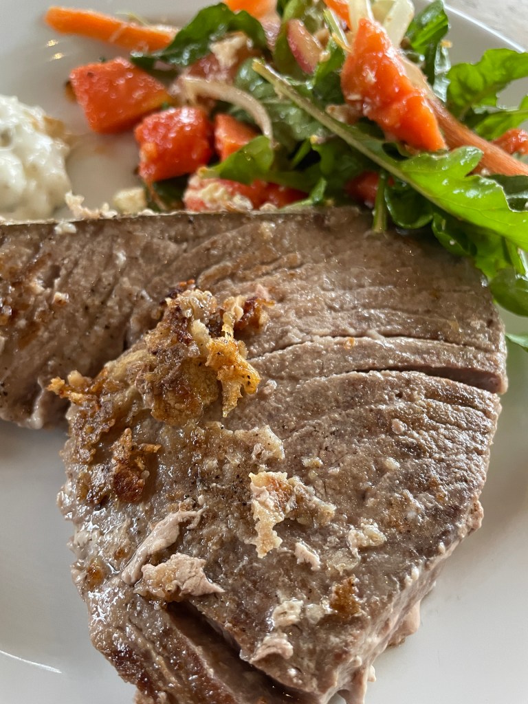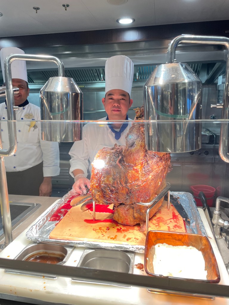 The Garden Café is the buffet restaurant and is the typical buffet style with multiple dishes of many cuisines. They usually have a different theme each night or a specific roasted meat. Rib Eye, pork, lamb, chicken and turkey, its all been pretty good. We are certainly not going without our protein! One night they were advertising “Steamship” as the specialty. We asked, what is this? Beef, they said. Ok lets have a look. Have you ever seen a whole cow leg roasted? Well, that is what Steamship is. We could not believe our eyes at the size of this roasted piece of meat, complete with bone out of the top! 10 hours cooking at 120 deg apparently, and it was delicious.