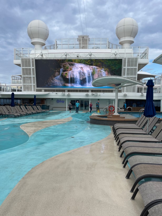 We have not spent much time out on deck because of the weather. We thought that we would start getting better weather by the time we were a few days out from Miami. Surprisingly this was not the case. The temperature got up to 20°C on the last day, but the wind was still cold. The pools remained closed and half empty until day 8, a small handful of brave soles got in.
