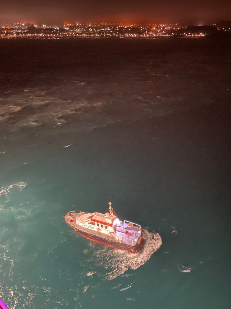 0445 I got up and could see the lights of the island in the distance. We stopped just outside the harbour of Ponta Delgarda. It was dark, but you could see the beach not far from us. The captain kept position using the starboard thrusters, the wind was pushing against our port side. The pilot boat approached and came alongside beautifully, and they loaded the poor man from the lower deck in a stretcher. He was waving so I felt happy that he was at least conscious and aware of what was going on, we never did find out what actually happened to him. The Pilot boat left, and we slowly moved off and headed back on our way. The diversion was a welcome change and something quite different. I was fascinated in the while process, having been involved in this sort of operation back in New Zealand. It was great work by all involved, very efficient and professional.