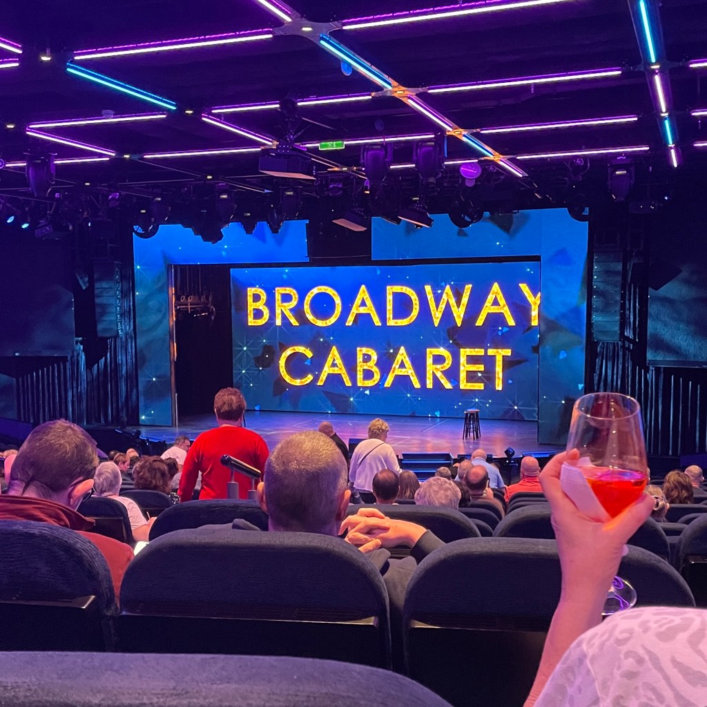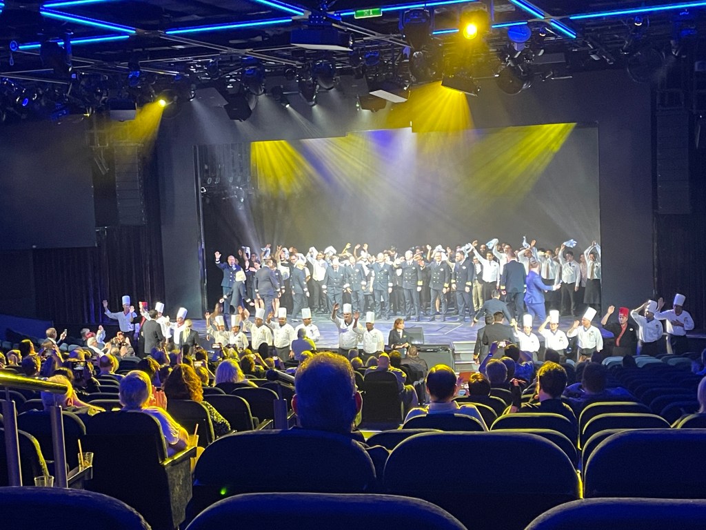 The staff are so friendly, everyone has a smile and hello. I have been amazed to see the natalities of the staff. Everyone’s name badge has where they are from. I read somewhere that the crew are made up of over 50 different nationalities. It is a wonderful mix. Evening 10 after the Broadway Cabaret, a huge collection of the staff came onto the stage for a farewell. Representatives from every part of the ship from the engine room, catering, housekeeping, retail, bar and restaurant, to the captain, were there. As they filed out, up the stairs of the theatre we were able to say thankyou and show our appreciation. As we then filed out of the theatre, they were all there, almost as a guard of honour, thanking us! I was quite overcome by this gesture; this could almost be my highlight of the trip.