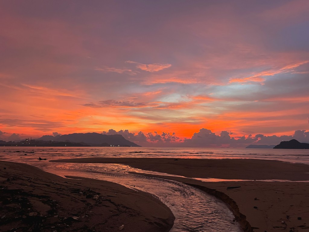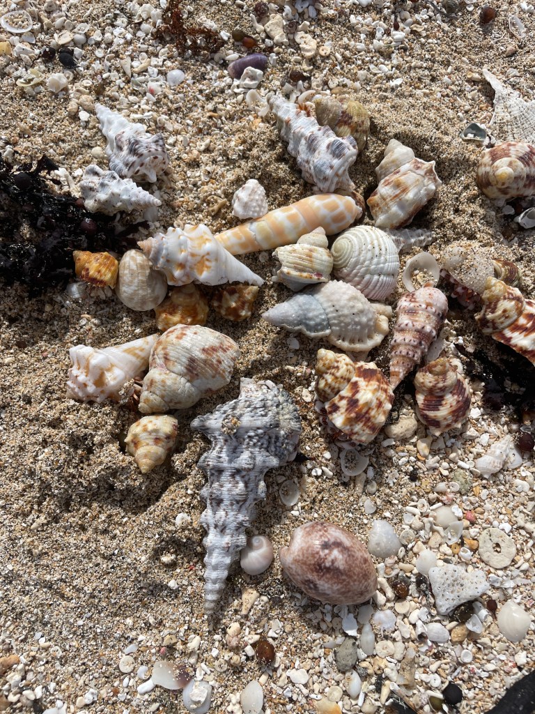 You know there are no other footprints on this beach, just us and Jenga. Nothing but that beautiful sun coming up, that golden hour. It is a bit cooler than what it will be as the day progresses. Overnight there has been a high tide so there is a new dump of sand and shells. We love beach-combing, looking at all the beautiful shells, but of course the nicest ones are all taken by the hermit crabs.