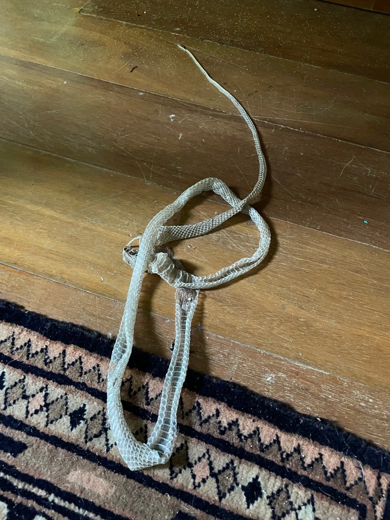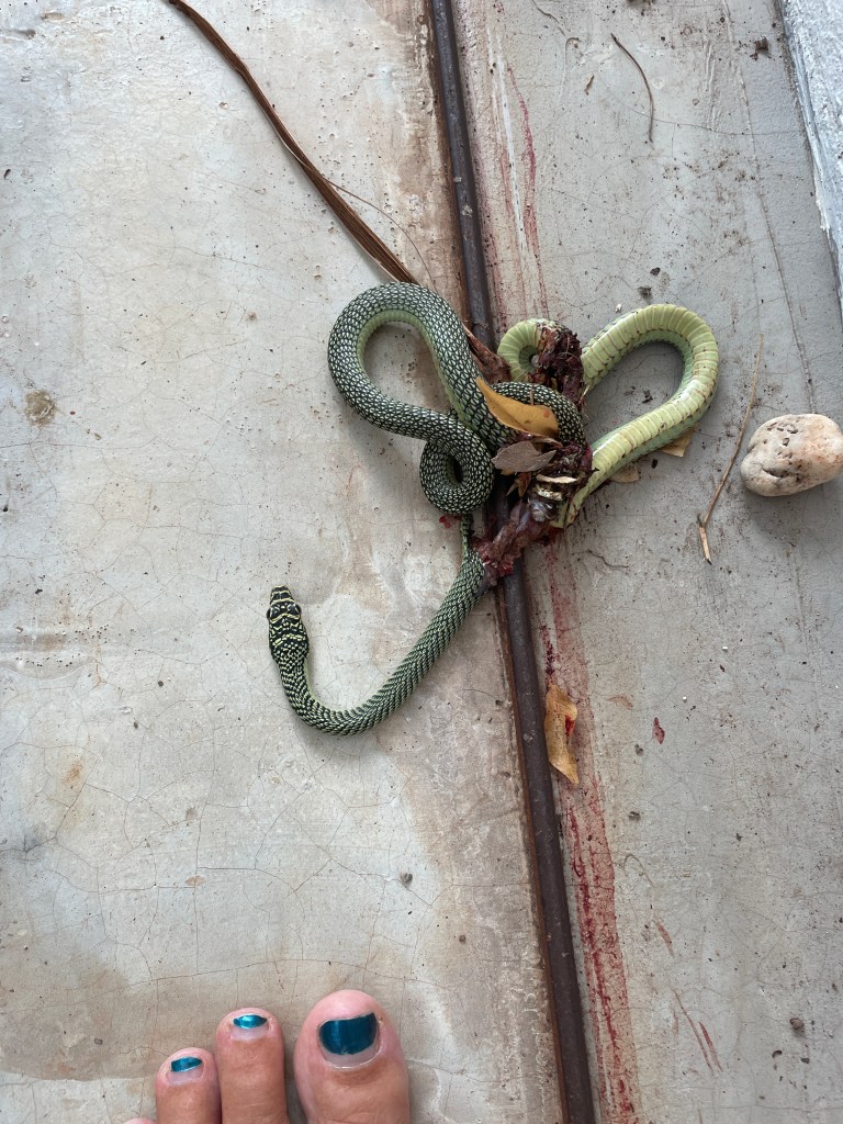 Oh the snake!! Driving into our drive we see a green tail disappear under the gate. It is an electric gate, runs on steal wheels along a rail – you know the type. Not sure what the tail belonged too, lizard? Snake? Gate opens, park the car and go to see where “it” went. Oh no! the gate wheels had chopped the snake right in half! You could not have done this if you tried, the poor snake. He was not a poisonous one and he was quite pretty but chopped in two places! Unbelievable!