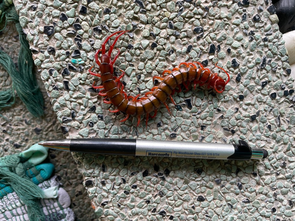 There is nothing on this island that can harm us badly. Except maybe for the pigs, but I don’t think that is very likely. There are no snakes, or deadly spiders like in Australia. But oh my, the spiders are huge! The Huntsman spider is here and she is very intimidating to look at, but harmless. There are plenty of spiders in the bush and they are very proficient at building webs right across out path. When we walk, we carry a stick. We wave it in front of us to catch the webs. It is a horrible feeling when you walk right into one! Mosquitoes, yes but not that bad. There are rats and mice around, but that is to be expected and they are more annoying than anything else. And that is why we have a cat, right? The worst thing is the paper wasps, we have both been stung and it is not pleasant, but again – not going to kill us!