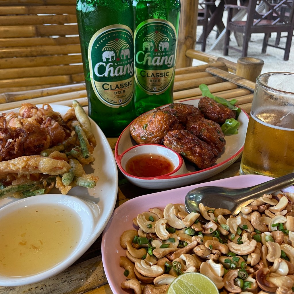 fish cakes, fried cashews and tempura veg and squid – and of course a couple of large Chang!