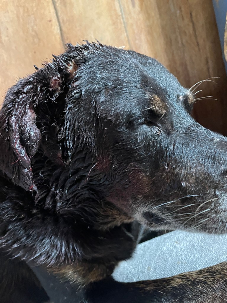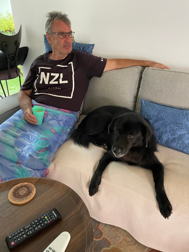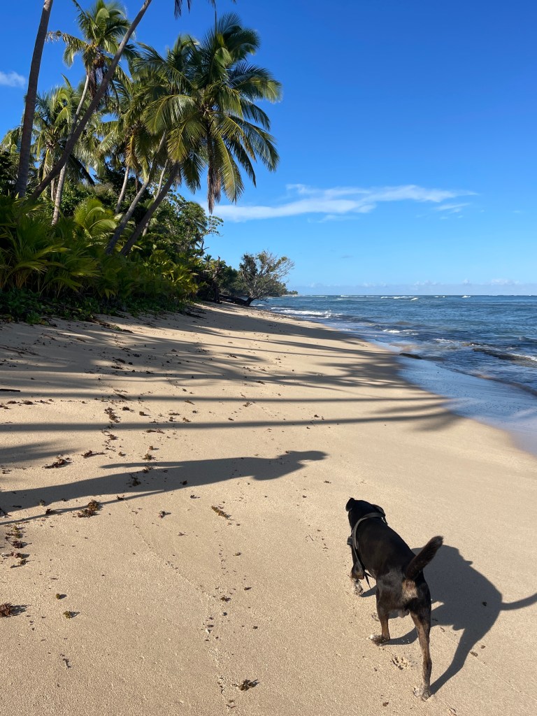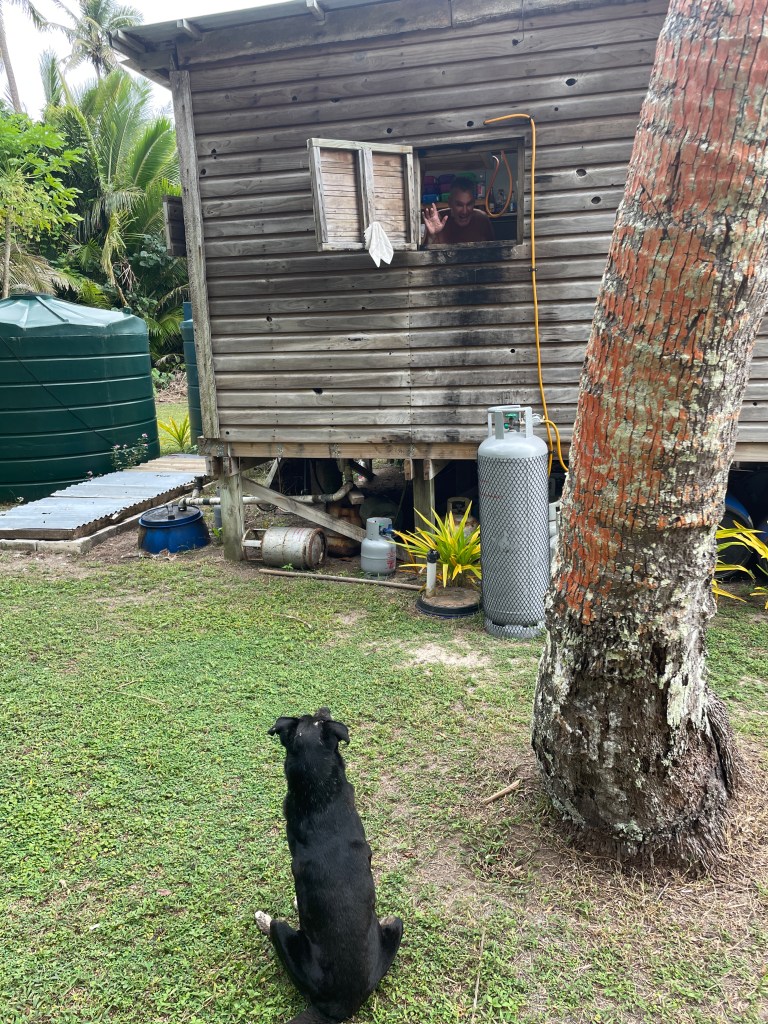 Having said that, we thought we might get fired in the first few days of being here. The dinghy disappeared on our first night here, off the mooring right outside the house. A mystery which will probably never be solved. Then poor Jenga, the dog, was mauled by either another dog or perhaps a pig?? Blood everywhere! Big wounds around his head and ear. Very pleased this happened while the owners were still here as we had not had enough time to bond with him. We are very much bonded now! Poor guy! He remained sedated and on antibiotics for a few days after our owners departed. And then the cows; there have not been cows on the property for 10 years, first day on our own and the cows come in, sheesh! Thankfully they didn’t do too much damage, and now that Jenga is better – and not in a drugged up state, the cows have not returned!