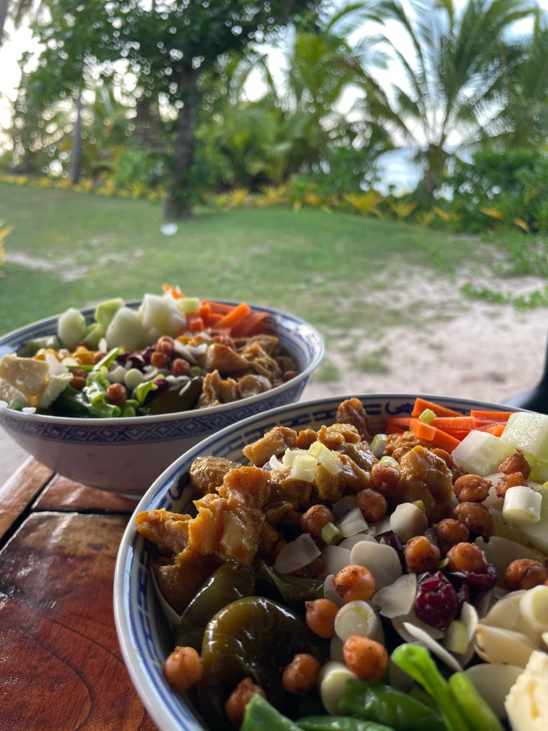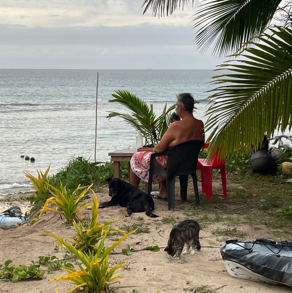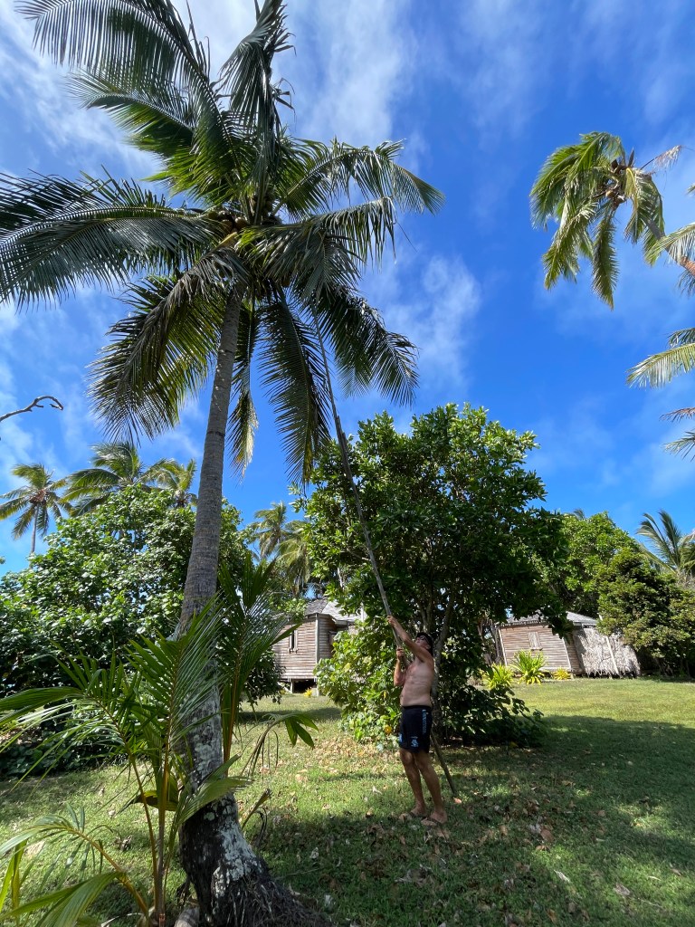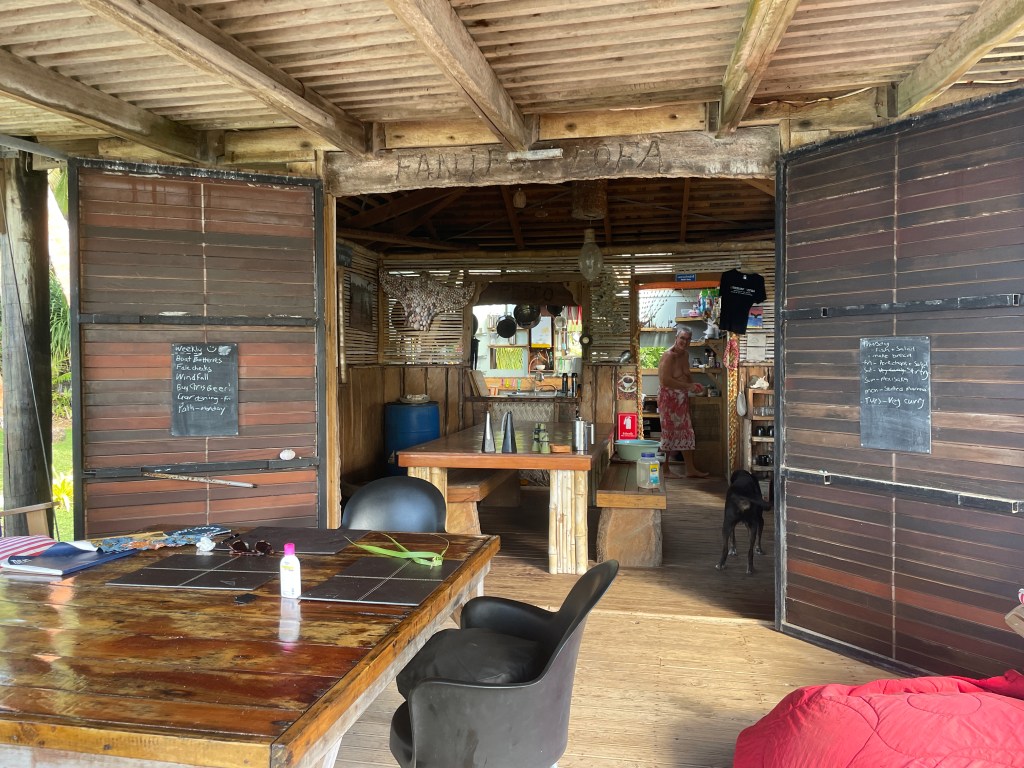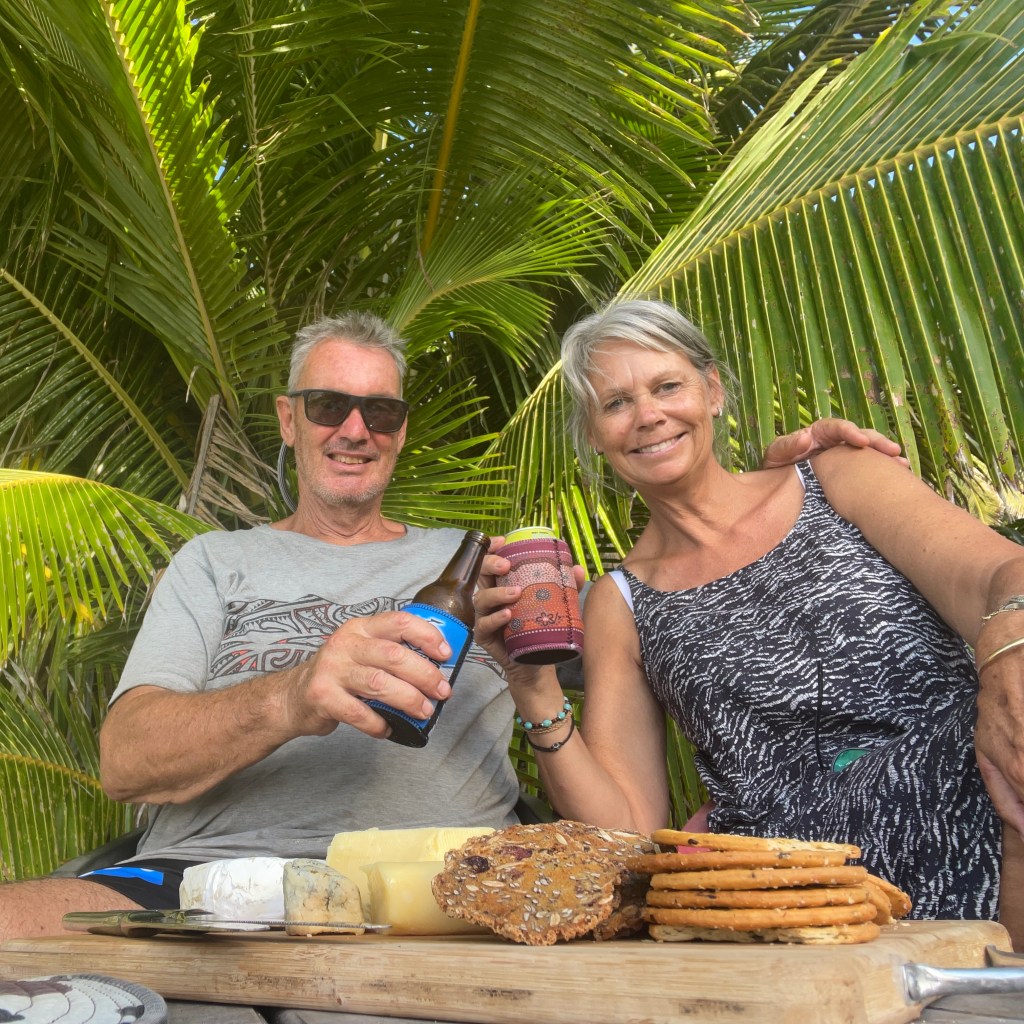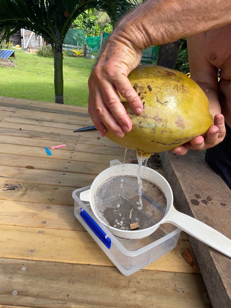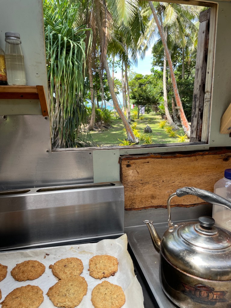 We are finding this to be a healthy lifestyle, we are out in the elements all day and by 7:30pm we are exhausted and ready to retire to the house fale and watch some Netflix – yes, we do have a TV, there is even a spare!! Planning and cooking food is a daily job, the nearest shop is a boat ride away, over a reef, so we can only go when the weather and tides are favourable. We are baking bread, loaves, cookies, making our own sauces and curries and pizza dough from scratch. Chris is getting coconuts each day and we are drinking fresh coconut water – that has got to be good for you! We have planted some seeds and are coaxing them along; we are hopeful they will yield some food soon. Neither of us have had a lot to do with gardening. We learnt a lot at the Chateau in France, but that garden was already established – so watch this space, when I start singing and telling stories to the plants, maybe send help!