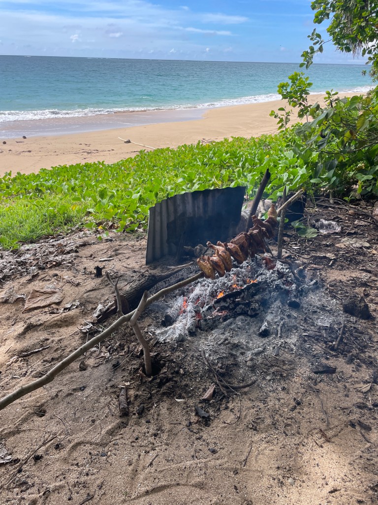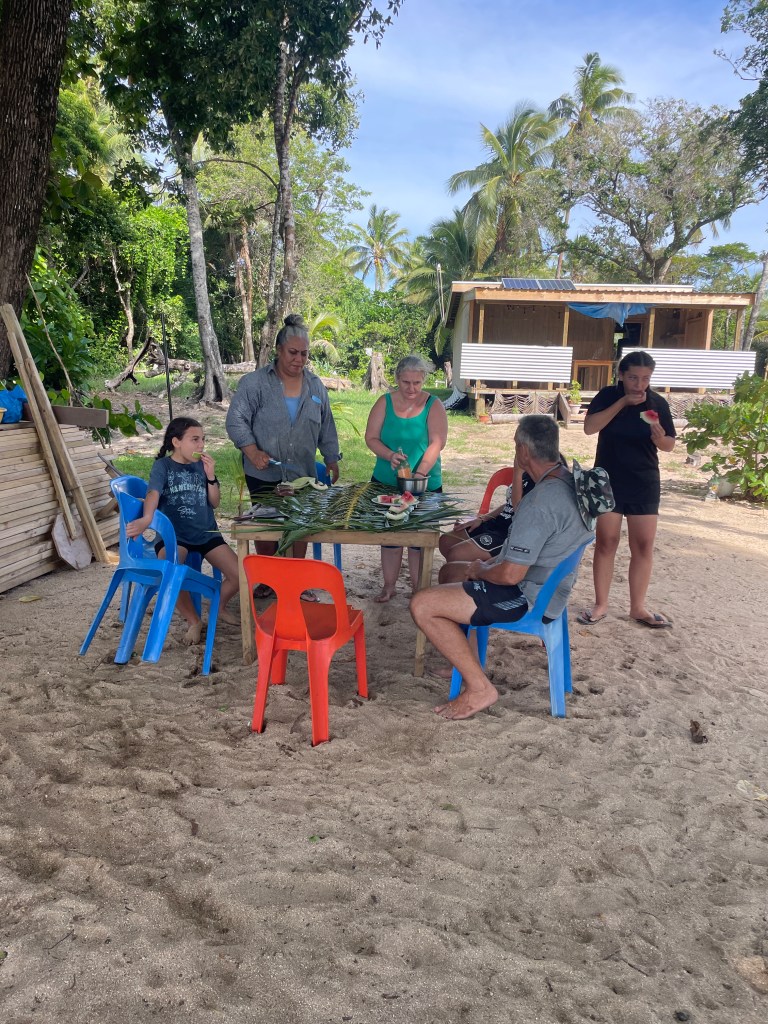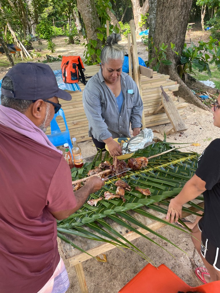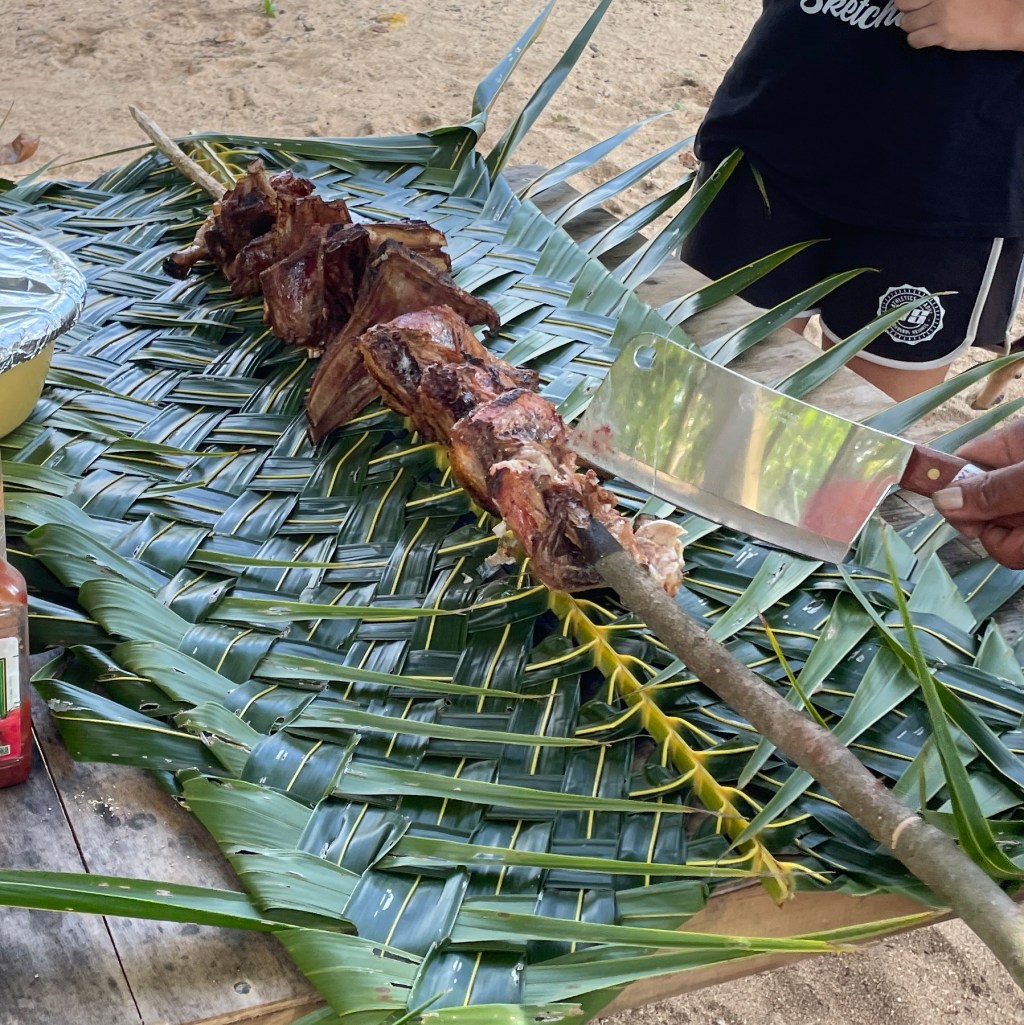 We had the best afternoon. The whole family was there, we met the kids, 3 girls, and Aunty. Dad had the fire going. He used branches from the trees to make a rotisserie for some lamb and chicken and started cooking over the fire. There was a pot of boiled root vegetables. Aunty weaved a table cloth from a palm frond and when the meat was cooked, we all sat around the table and had a feast. The meat was cooked to perfection, dripping with flavour, so simple yet so perfect. Grease all over our faces, licking our fingers, the kids fighting over the juiciest piece, could this have been any better! We were not expecting to stay for a meal. The kindness and hospitality was so beautiful, we felt like part of the family.