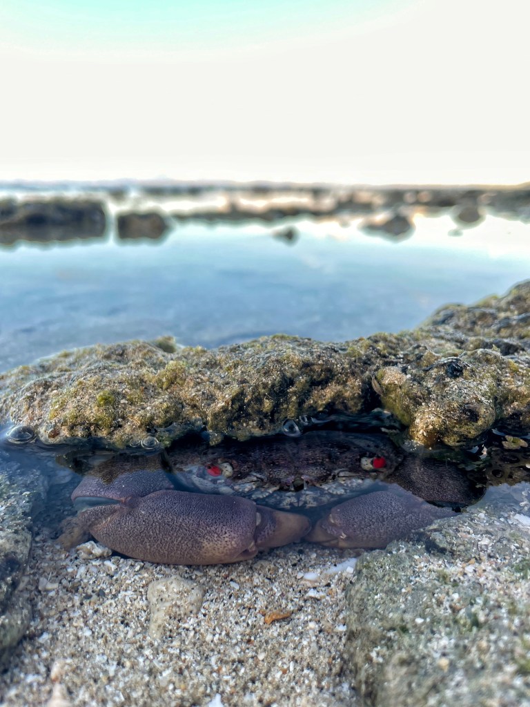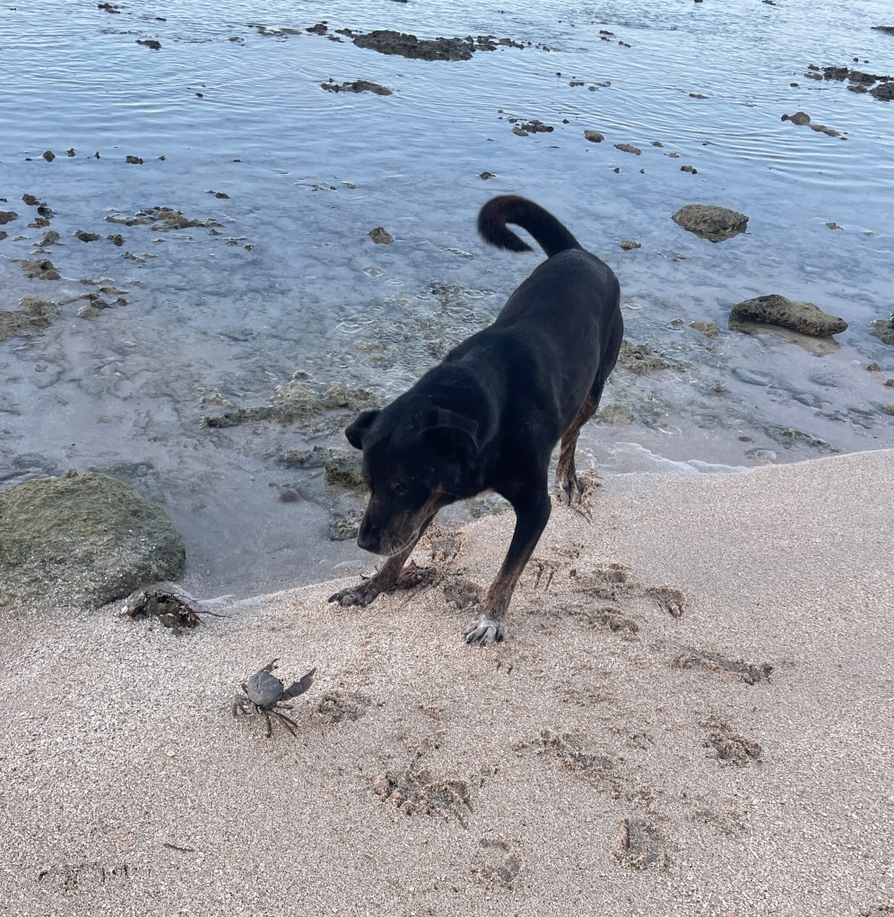 And then there are the bigger grey/green crabs, they are a lot bigger. I don’t think they would be big enough to eat but they are much bigger than these other little guys. They have beady red eyes spread quite far apart. They are so funny, they see you coming and back into the crevasses of the rock. As you move around the rock they scuttle around backwards to the other side, they think they are being hidden. Then Jenga will see them and bark and their claws stick straight out; attack mode. They just walk sideways very slowly, step by step, claws up facing their opponent. Jenga barks again, and the crab keeps walking, claws up, until he ends up back in the water to hide.