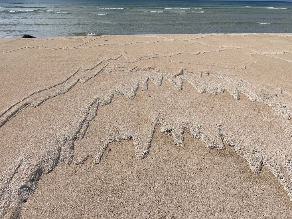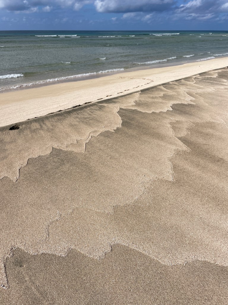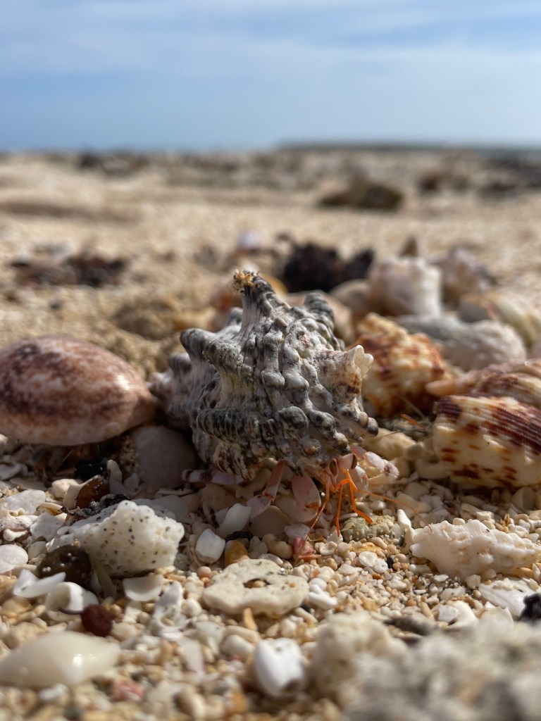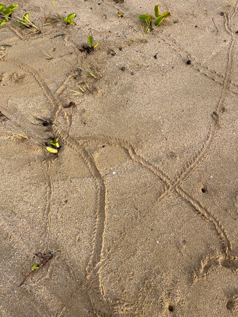 I love it in the mornings when you come out onto the beach. You see evidence of the overnight activity of the beach inhabitants, the crabs! The little tiny hermit crabs with their gorgeous shells. They come in all different shapes and sizes. There are long cone shape shells and short stubby shells. They are always so beautiful. They are never broken or damaged. You see their tracks all over the beach, their big heavy shells dragging in between the row of little claws.