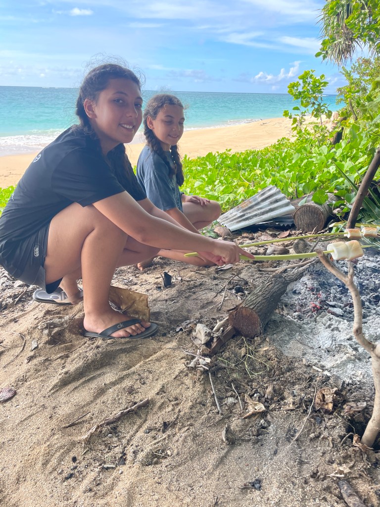 After the meal, we had fruit grown on the island. More sticks were sharpened so the girls could toast marshmallows over the hot coals. They were so soft and melty, squished between cookies and ended up all over the girls faces, so much fun. Reluctantly, we had to leave. We needed to get ourselves back across the track. We also had to return through the lagoon before the tide got too low. We had a great afternoon, days like this a gold, this is what it is all about, this is our “why”