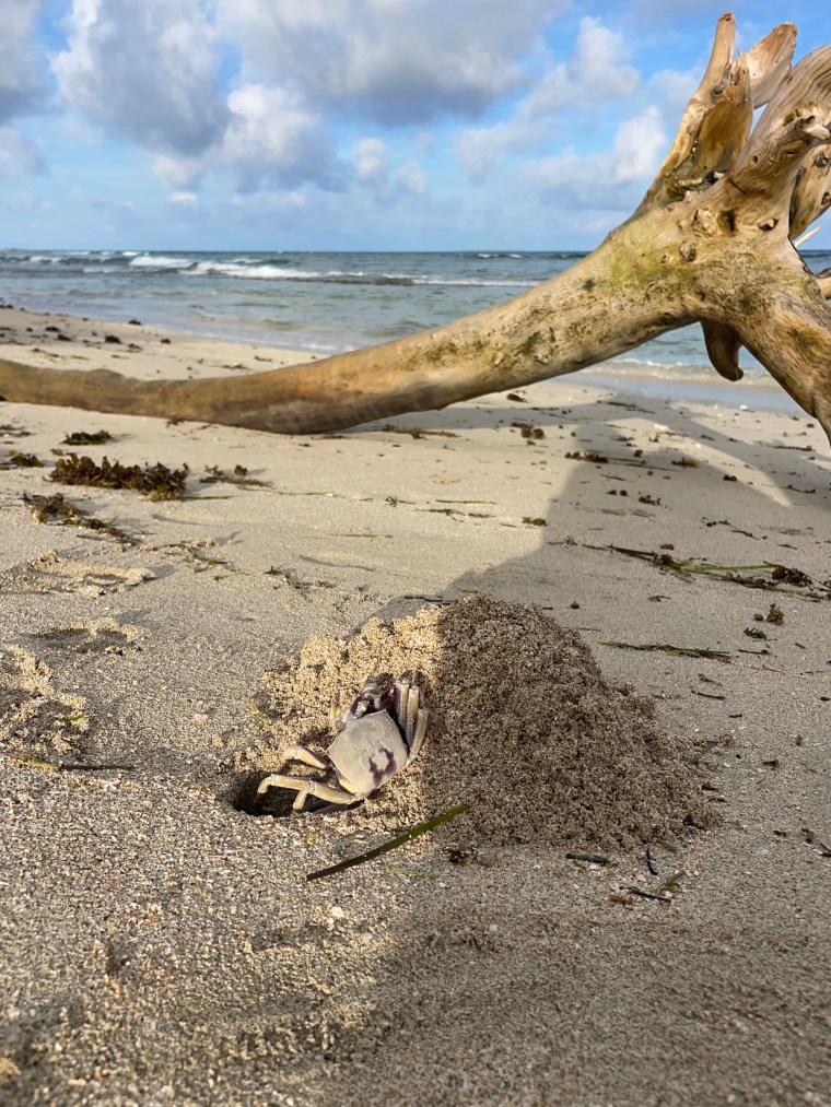 The little beige and black crabs, they are kind of mid-size. They run sideways so fast. Their little black eyes, close together sticking up like little antennae and their little legs all splayed out side ways. Scuttling down the beach into the water as soon as they see you coming. They dig holes in the sand, takes them hours. They are very meticulous bringing sand out of the hole and dumping it one arm full at a time. It is such a labour of love.