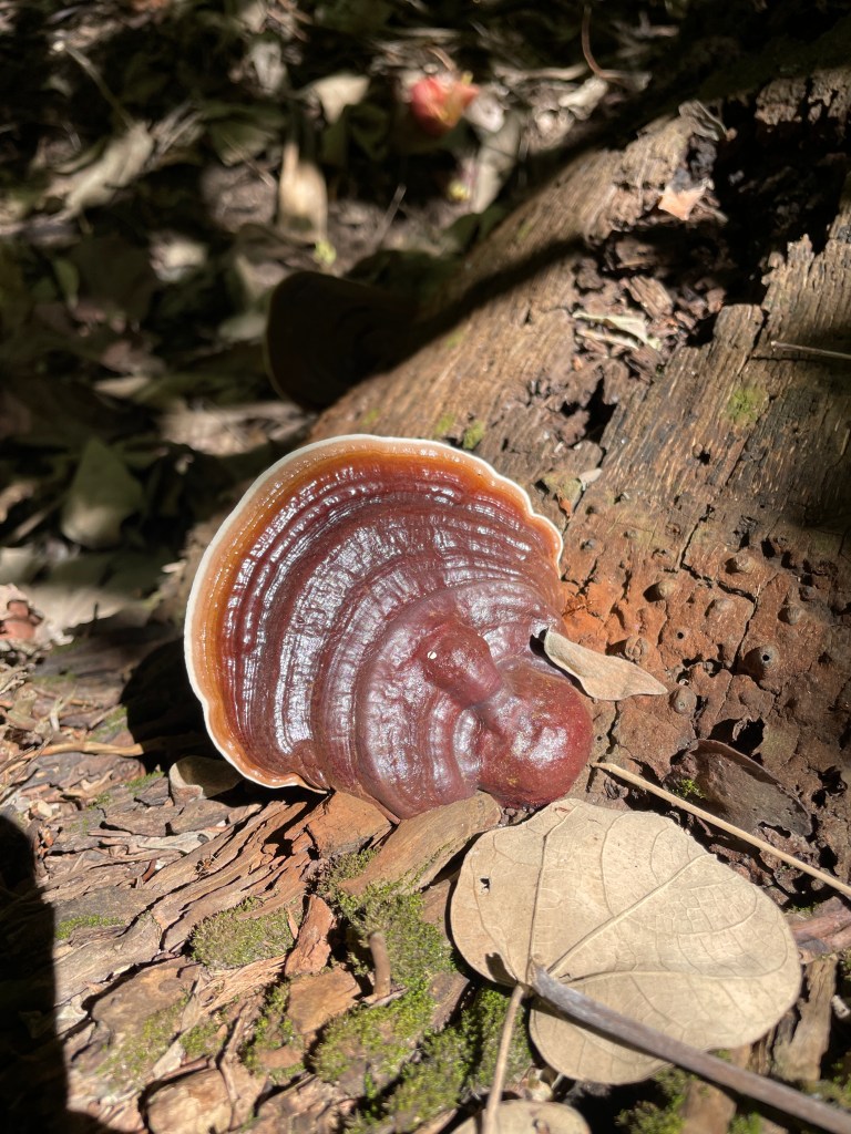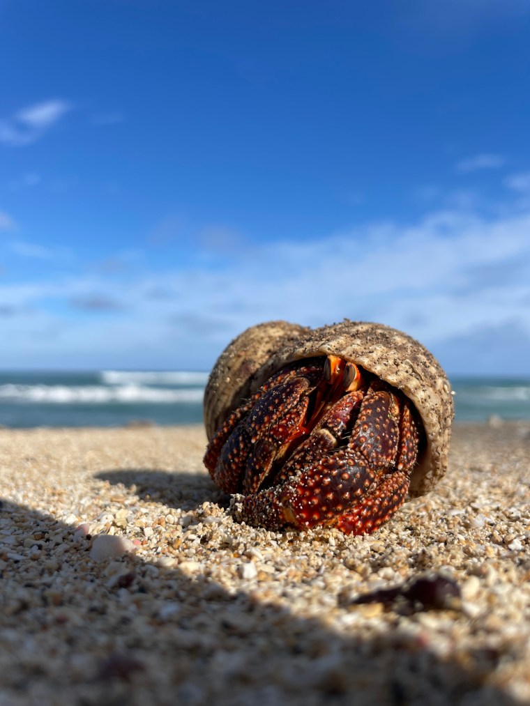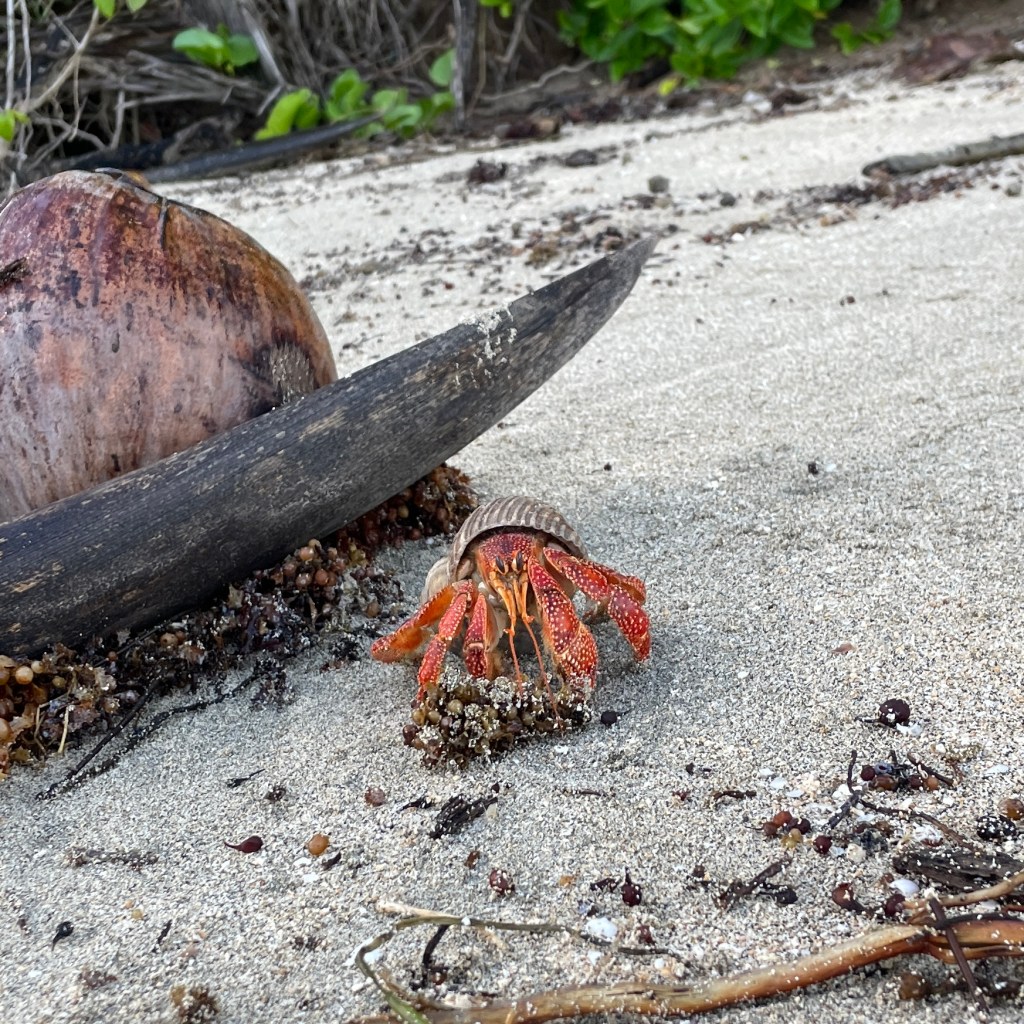 The red hermit crabs. I think they are the coconut crabs, as we find them in the bush as well, on top of coconuts which have fallen. They have all got the same kind of shell, a kind of a rounded shape, all about the same size. It is so funny in the mornings. They have these meetings on the beach around a coconut husk. Sometimes 6 or 8 of them and they are all just climbing on top of each other having a good old yarn. Then you come along and POP inside their shells they go, I can’t see you so you can’t see me! They are so round when their bodies are inside their shell, sometimes they roll down the slope of the sand. I wonder what that feels like for them, so very cute.