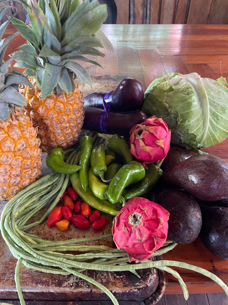 One day we get a message from our home-owners (currently in Bali). They say that we are to meet a guy at the end of the next island on Saturday. There is a box of cargo to pick up. So we just go and get on the boat and make our way across. Collect said cargo to find it is actually a box of vegetables and fruit for us. Oh My Goodness, we were so excited to see all this fresh produce. We feel very overwhelmed by the thoughtful kindness. What a surprise, just like Christmas all over again! We spent the next week creating even more amazing dishes with fresh produce! Thank you again Glen and Karen!