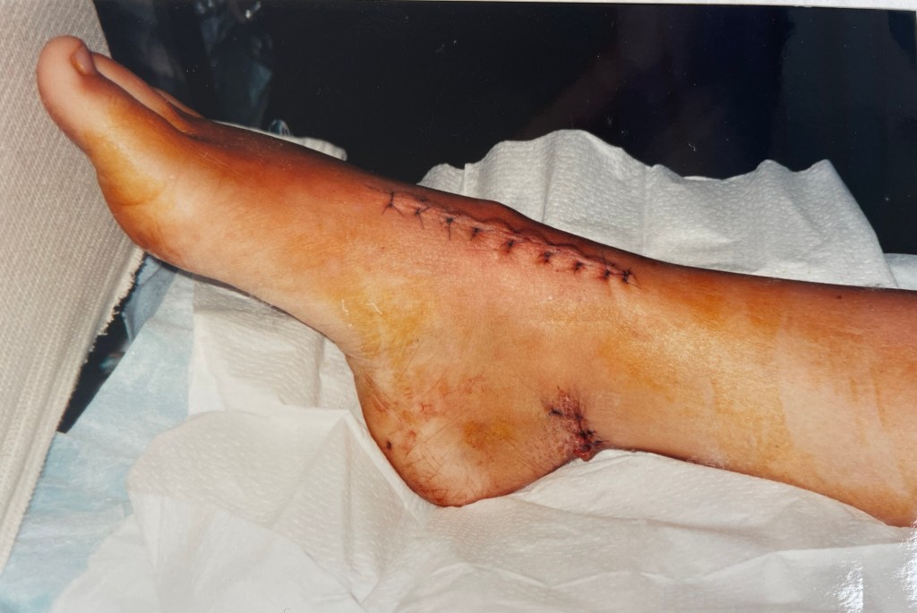 Here I sit, 27 years later, almost to the day, just out of hospital following a triple Arthrodesis operation on my foot. That is a fusion of 3 joints in my ankle to us laymen. As a direct result of the accident, I have developed severe Post Traumatic Osteoarthritis. This has been causing more and more pain as the years go by. Fusing those joints will take away the pain. More screws and a plate – can’t wait to see the new x-ray! Apparently my foot was jammed on the brake at the time of the accident taking full impact and snapping my Talus in half. This tells us that I saw the accident happen and reacted – but I don’t remember. Isn’t it amazing how our brain can protect us from traumatic memories..