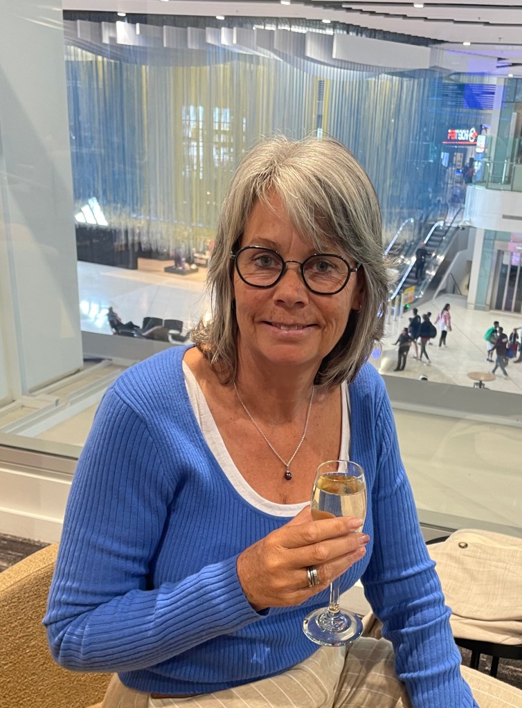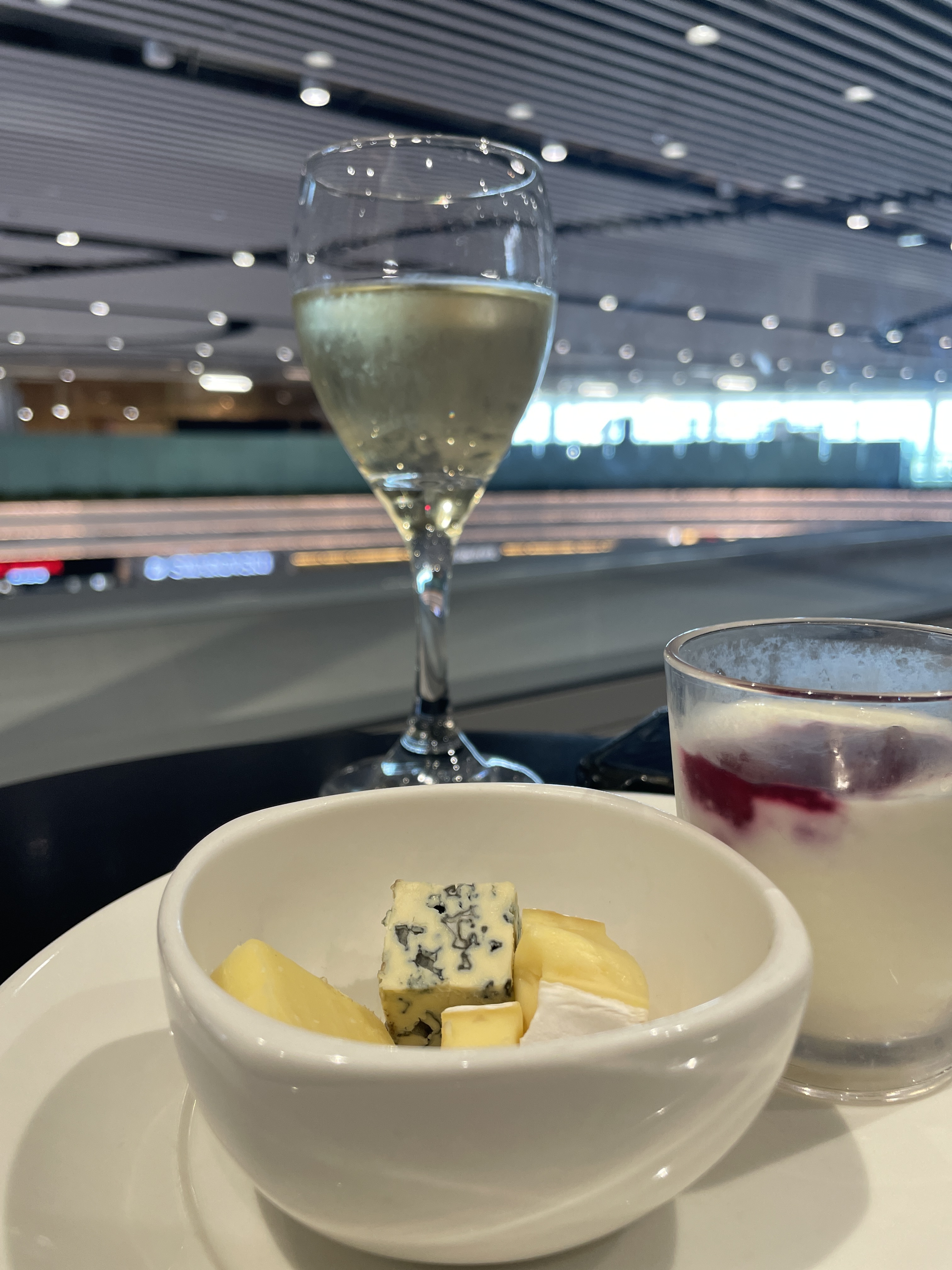There is cooked breakfast on offer, a barista making coffee, all pastries and cakes you could dream of, and a full bar. 1 plate, 2 plate, 3 plate, oh hang on, here comes lunch! The mandatory glass or 2 of bubbles, even though it is only 10am. Oh this is lovely. We took a seat right by the window looking down at the departure lounge. Passengers waiting for flights, sitting on plastic seats, trying to get comfortable drinking cuppuccino’s out of takeaway cups – this is usually us by-the-way.
