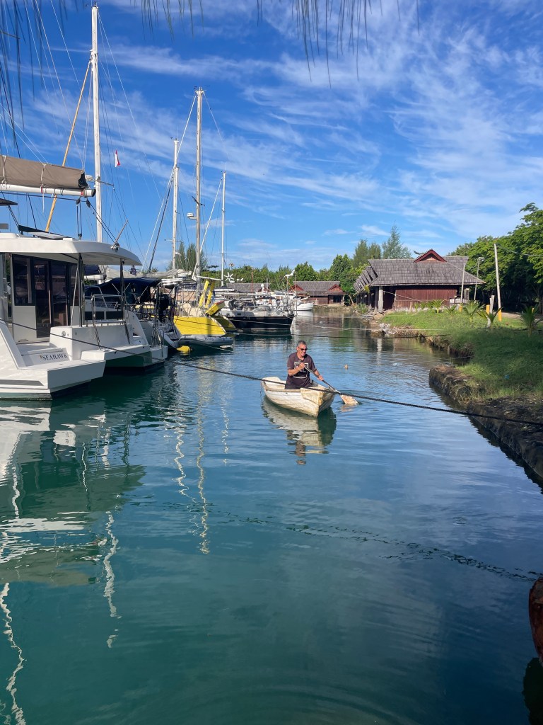 It was 0630, and though the manager knew we were arriving today, there was no one around. A quick discussion on how to get out to the boat as our dinghy is on the boat; not helpful. A call to the manager, who offered us to use the one tied up down at the other end of the marina, it has no oars; but there is 1 paddle.