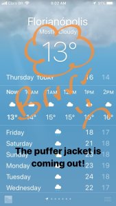 September is spring time, just like NZ. We arrived in Rio 21 August and left Florianopolis on 23 September. We were told by a local that September is very fickle, cold, hot, rain, wind, calm – all of the above. We have had a couple of really hot days and a couple of days freezing cold, so we agree totally! Probably not the choicest month to visit the South of Brazil. Brazil is such an enormous country, we have talked to people from the North East and they say it is Summer all year round and looking on the map we can see why. 100’s and 100’s of miles north of here. It has been hanging around the 20deg C mark most days, which isn’t too bad, but there has been a nasty Southerly wind which makes it feel colder. Jeans and the puffer jacket have been worn on many occasions – as have the bikini and sun dress. We have made the most of the colder wet days by travelling on the bus rather than walking or cycling and doing indoor things and as soon as it looks like it will be sunny we head to the beach. We have had a high of 26 and a high of 14, the lows are around 14 – 18. Rio was wet, it rained most days we were there, but we were very lucky and when we visited the Christ and Favela, we had breaks in the weather and even got blue sky and clear sky for the fantastic views.