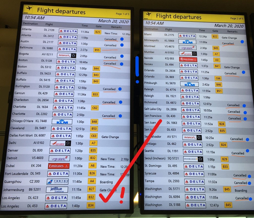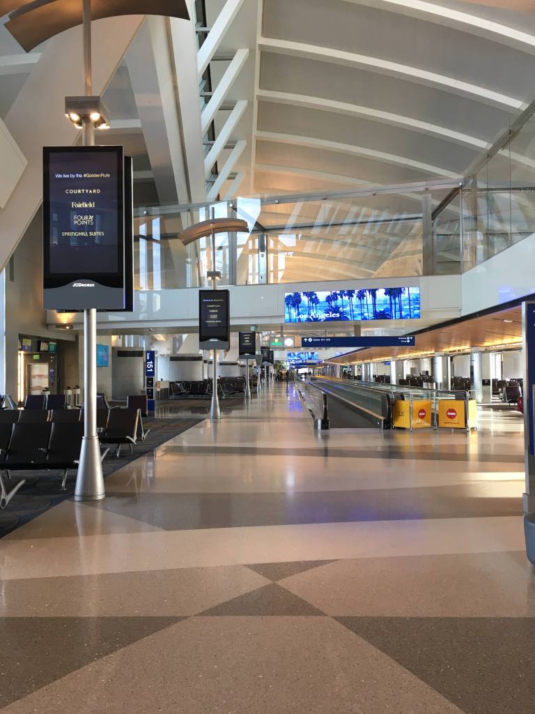 The flight board has many flights cancelled – but our flight looks like its still on! The man at the check in was so lovely. He knew that LA would not be our final destination today ( he guessed we were Australian – we wont hold that against him!) and assured us that our flight to LAX would go – “lets get you guys home” He said – almost brought tears to our eyes!