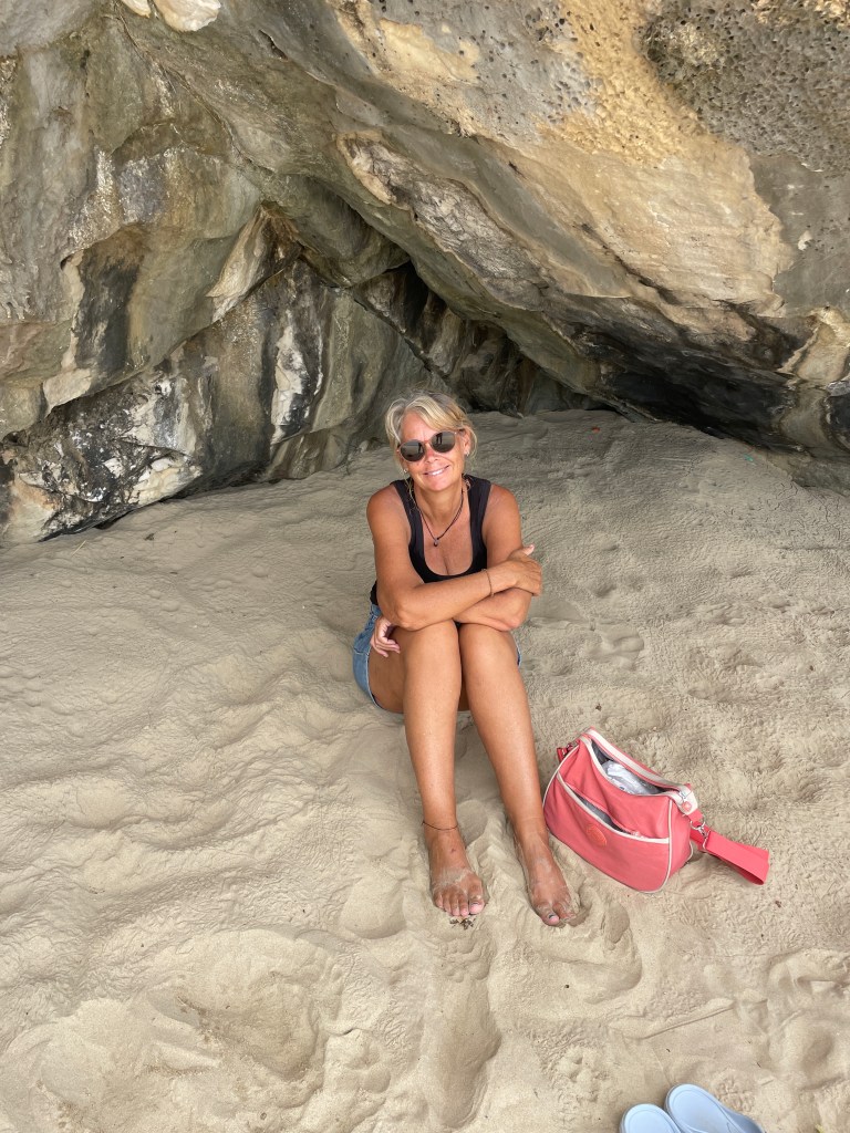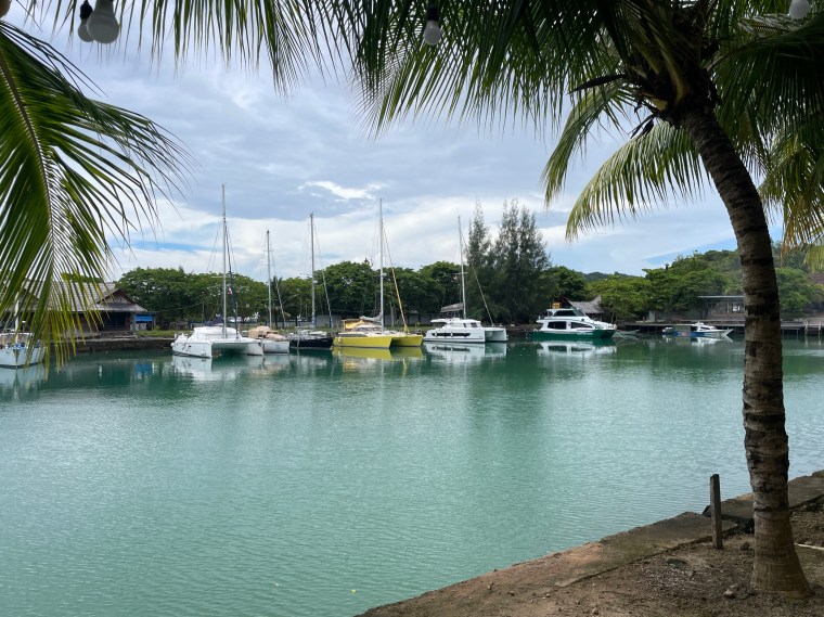 Coming back in is a little challenging. We have never had anything to do with the Mediterranean Mooring system which is used here at Tampa Garam. We had a good plan and had left the stern lines ashore where we could back in and pick them up with the boat hook – easy peasy. And it was. We came in and tied up like pros! High fives all round for us! Great day!