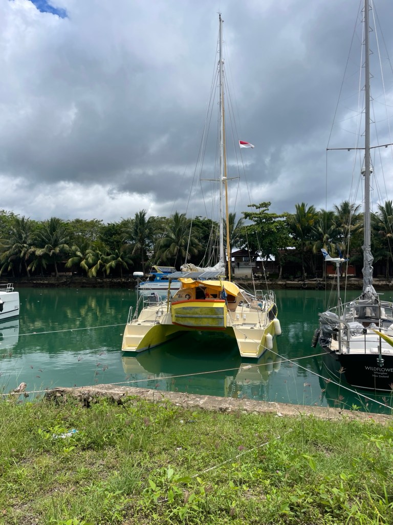 0700 We arrived to see the bright yellow boat nestled in between other yachts at the Tampa Garam Boat Harbour. We were knackered, having done an overnight flight from KL (Air Asia-tiny seats) via a 4-hour layover in Jakarta.