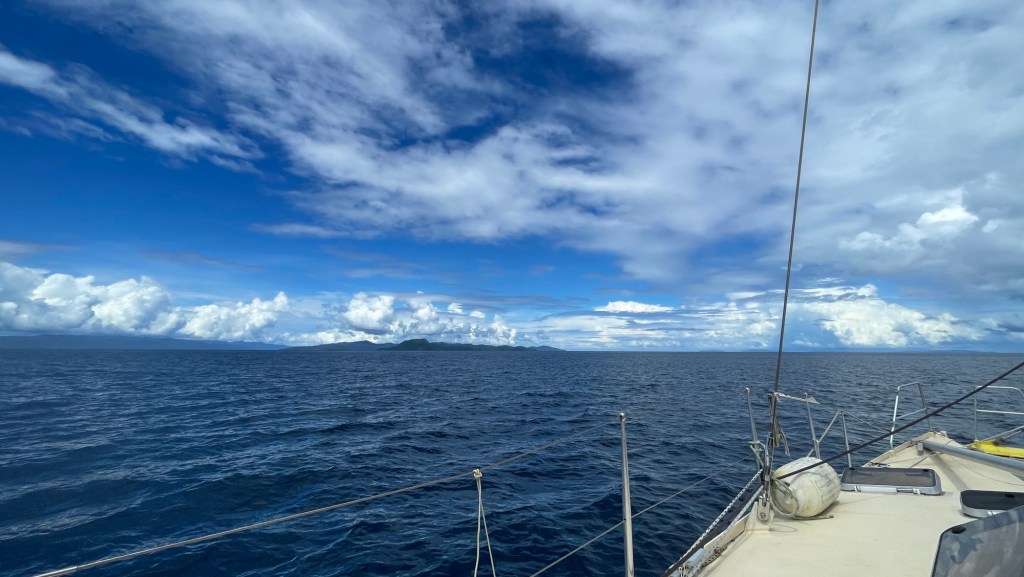 We are making good speed, 4.5 – 4.8knots, 37 miles to travel. Should make it by about 1530. We almost speak too soon, 5 hours into the journey a squall comes out of nowhere. This was not forecasted. The wind is getting up to 20 knots almost right on the nose. We are now only making 2 – 2.5knots. We take a few good greenies over the bow and things start falling all over the place. We were still towing the dinghy as it was so calm but wished we had brought her up on deck. We just have to punch through it and hope it passes soon.